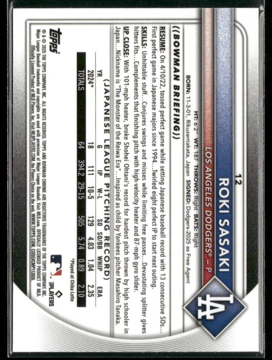 2025 Bowman Chrome Roki Sasaki #12 Aqua RayWave Refractor RC Rookie 153/199