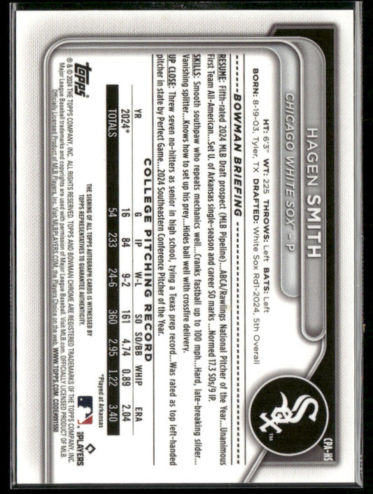 2024 Bowman Draft Sapphire Hagen Smith #CPA-HSM Chrome 1st Bowman Auto 052/199