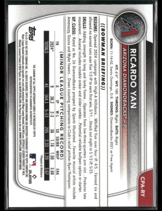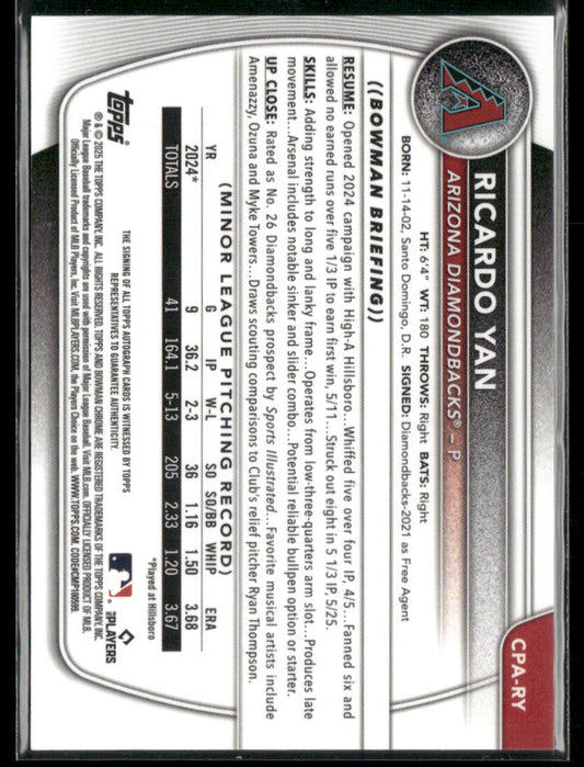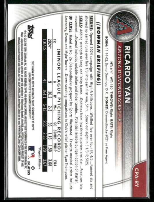 2025 Bowman Ricardo Yan #CPA-RY Mini Diamond 1st Bowman Auto Chrome 060/100