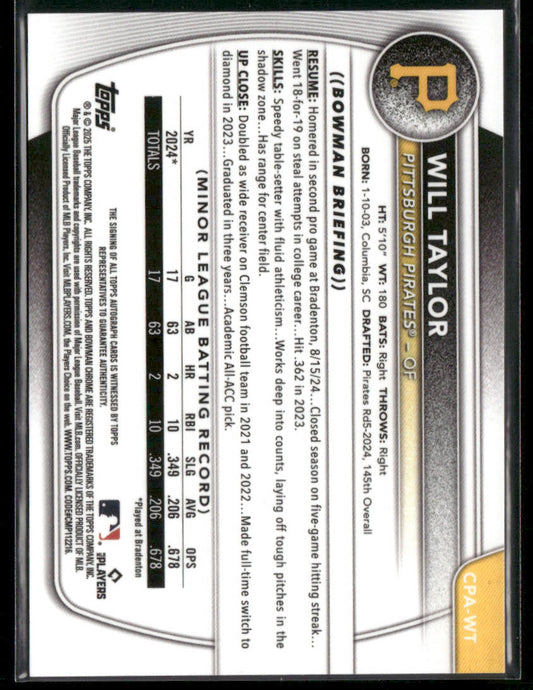 2025 Bowman Chrome Will Taylor #CPA-WT Blue RayWave 1st Bowman Auto 027/150