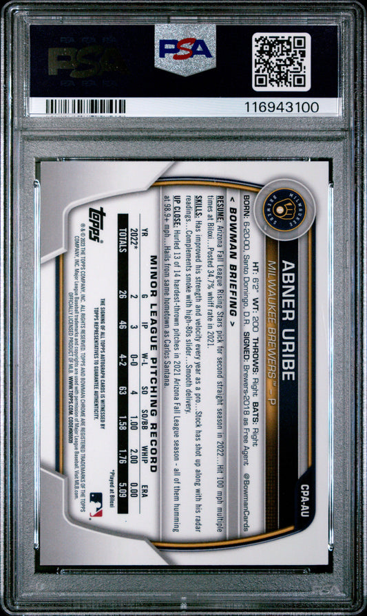 2023 Bowman Chrome Abner Uribe #CPA-AU Atomic 1st Bowman Auto 038/100 PSA 9