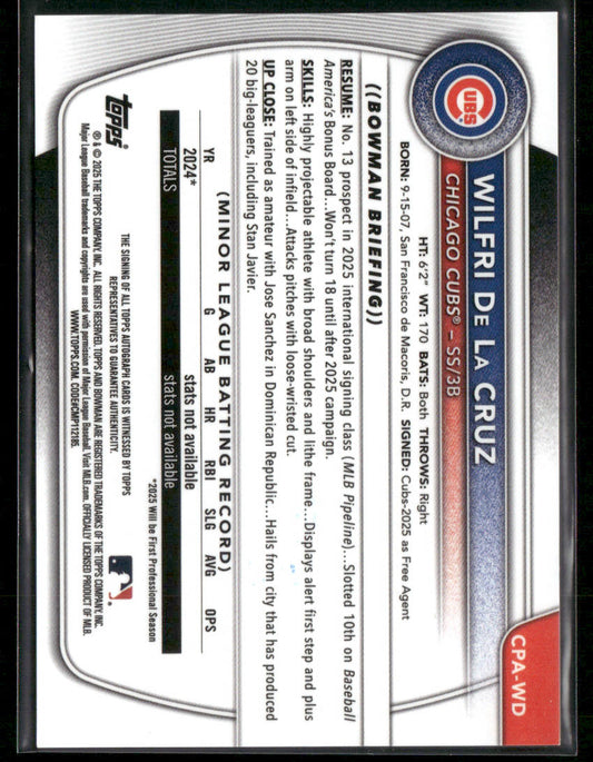 2025 Bowman Chrome Wilfri De La Cruz #CPA-WD HTA 1st Bowman Auto 136/150 (BT)