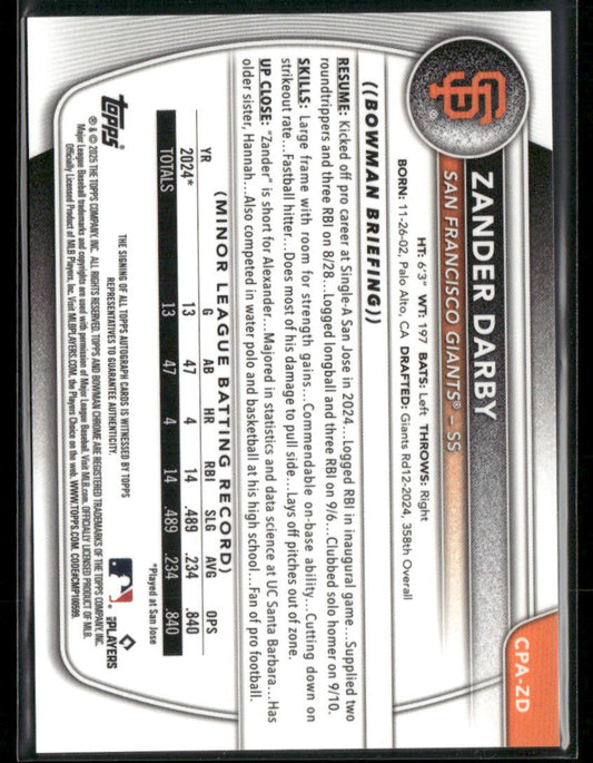 2025 Bowman Chrome Zander Darby #CPA-ZD Green Lava 1st Bowman Auto 50/99 (BT)