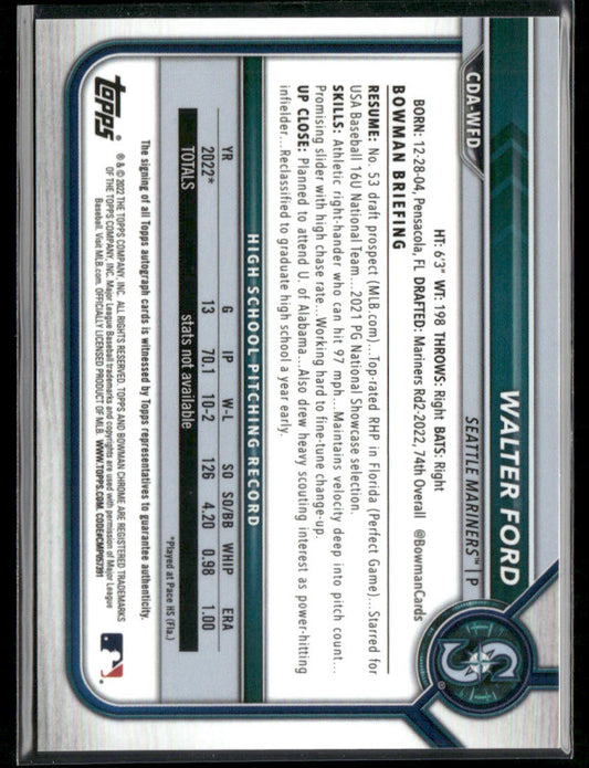 2022 Bowman Draft Chrome Walter Ford #CDA-WFO RayWave Refractor Auto