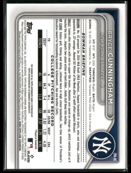 2024 Bowman Draft Bryce Cunningham #CPA-BC Blue Wave Auto 1st Bowman 020/150