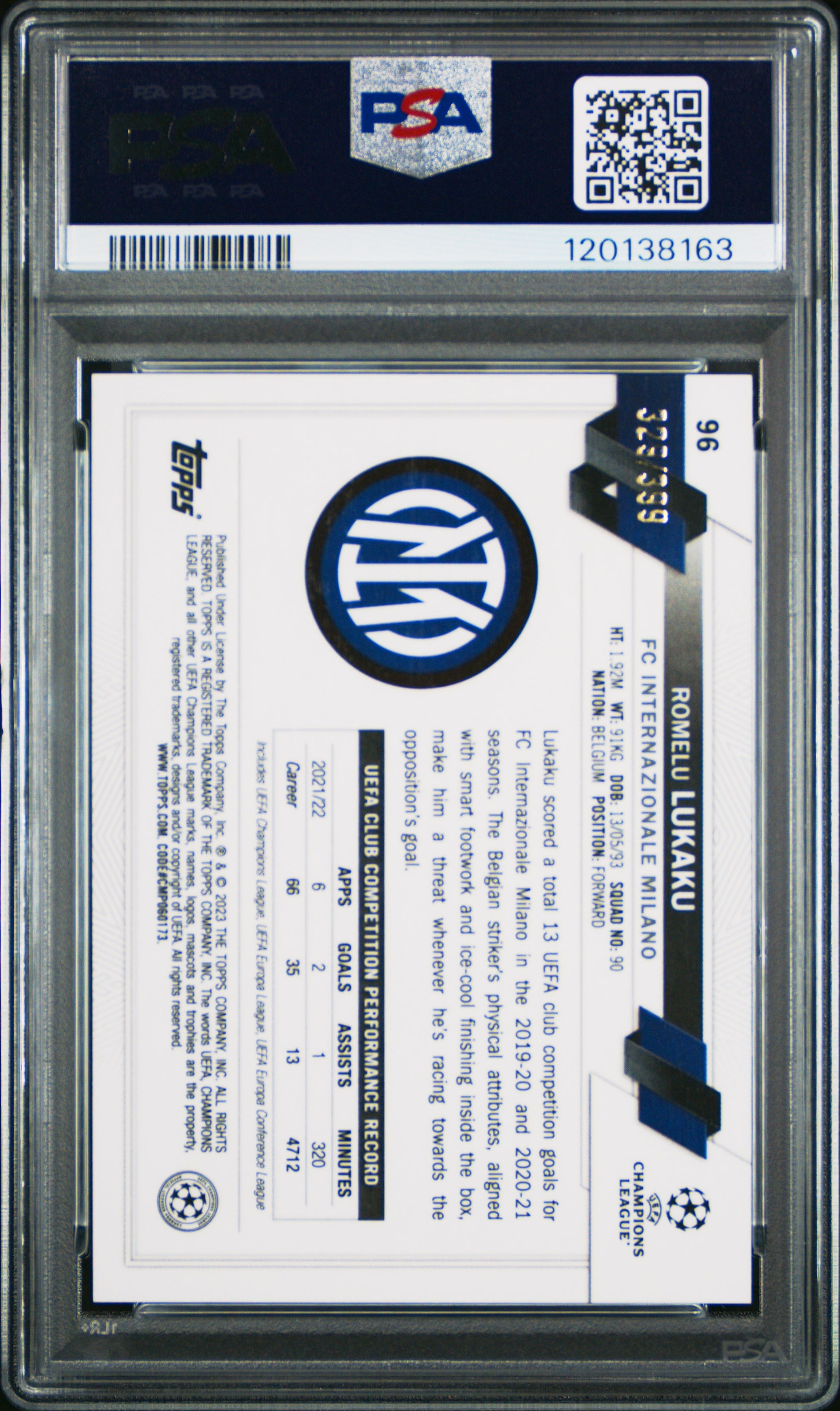 2022-23 Topps Chrome UEFA Romelu Lukaku #96 Neon Green X-Fractor 329/399 PSA 9
