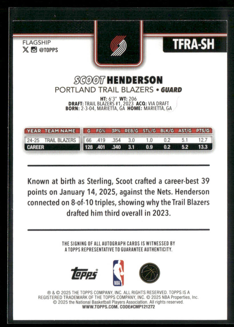 2025-26 Topps Flagship Scoot Henderson #TFRA-SH Real One Auto Gold Rainbow 16/50